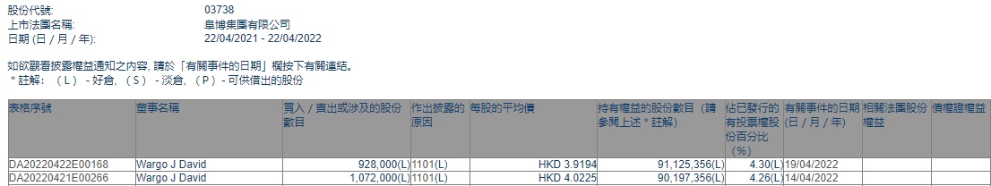 智通财经APP获悉,继4月14日增持107.2万股之后,4月19日,阜博集团非执行董事J David Wargo再度增持阜博集团(03738)92.8万股。据悉,本次增持每股作价3.9194港元,总金额约为363.72万港元。两日累计增持股数为200万股,累计增持金额约为794.93万港元。