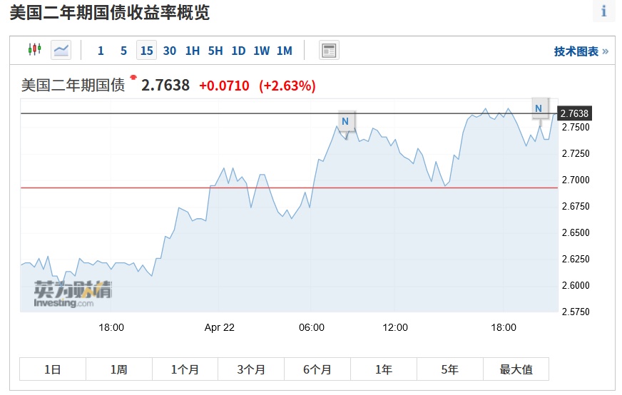 截至发稿,对政策敏感的2年期美债收益率攀升至2.76%的周期新高,年初时该收益率还仅约0.75%。