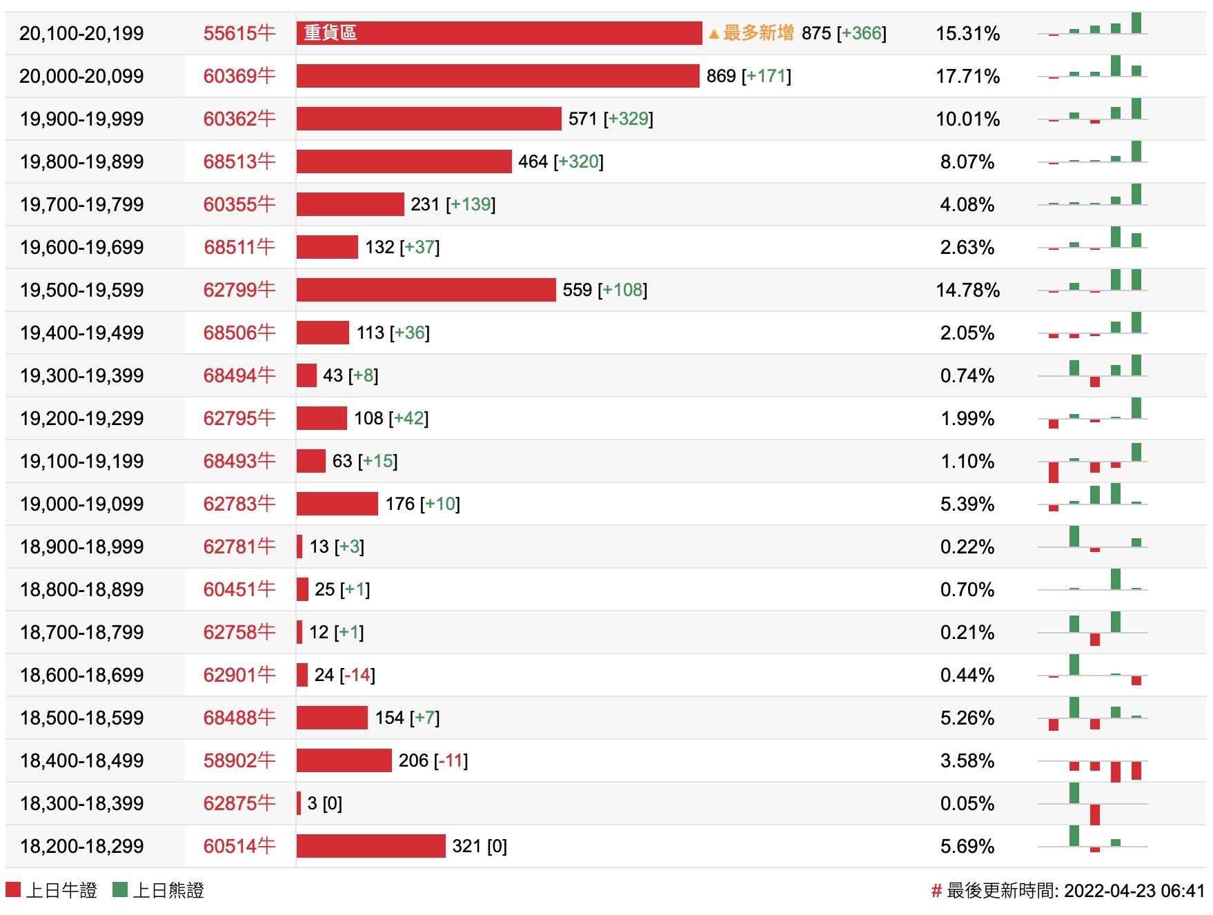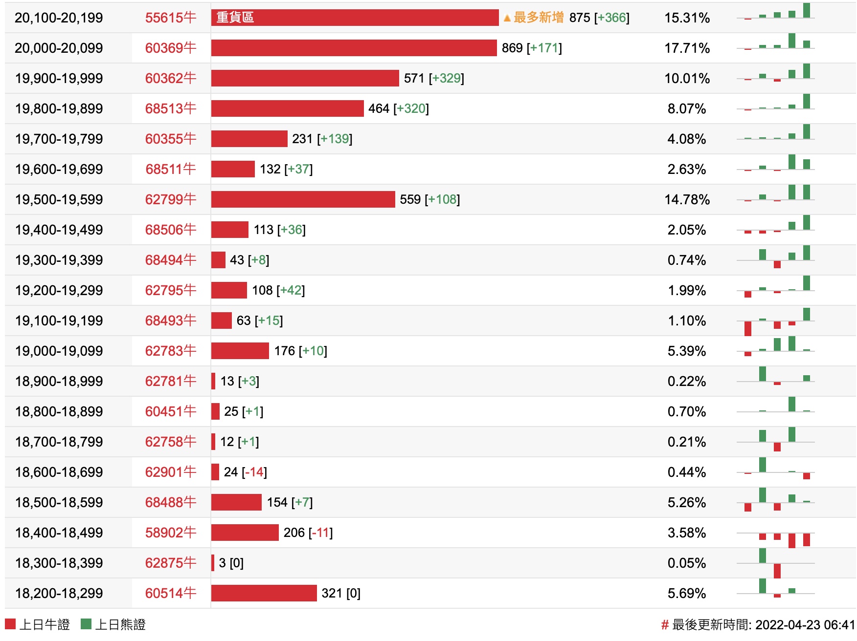 法兴恒指牛熊证街货分布图中的数据显示,熊证街货重货区在21200-21299区间,该区间最新熊证数量为866张,较上一交易日增335张;最多新增在21000-21099区间,该区间最新熊证数量为588张,较上一交易日增加588张。