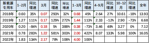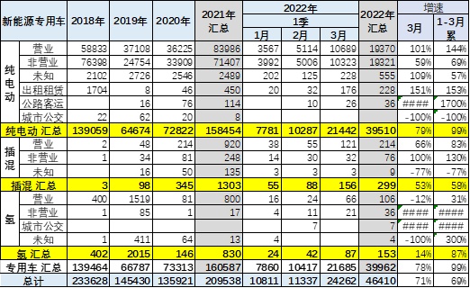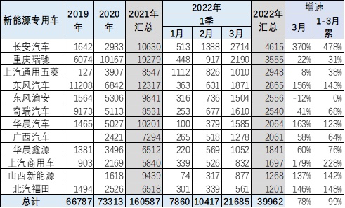 2020年新能源专用车7.1万台的走势相对较平稳。2021年达到16万台,增速126%,高于同期增速103个百分点,增长巨大,这也是低基数的因素。2022年 3月的新能源专用车市场销量217万台,同比增长78%。1-3月达到4万台,同比增长100%的增速,实现倍增的增速水平。目前看,今年新能源专用车走势将大幅超强于传统轻型车市场。