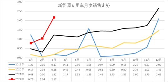新能源专用车2022年3月的市场销量2.17万台,月度环比走势大幅拉升,同比增长较强。