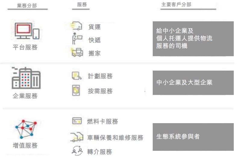 快狗打车的集成智能平台将司机与需要在同一城市交付货物和商品的托运人无缝连接起来,制定了促进透明度、信任和效率的交易惯例。智能线上平台使便捷、优质的物流服务能够满足大型企业、中小企业及个人托运人的不同需求,并协助司机获得可持续发展的机会。公司已建立由数百万托运人及司机组成的生态系统。截至2018年、 2019年、2020年及2021年12月31日,公司分别有约1450万名、1980万名、2400万名及2760万名注册托运人以及130万名、300万名、420万名及520万名注册司机。于2018年、2019年及2020年以及2021年,分别有3240万份、3340万份、 2710万份及2840万份托运订单在其平台上完成,产生的交易总额分别为人民币33.569亿元、人民币33.13亿元、人民币26.944亿元及人民币26.767亿元。
