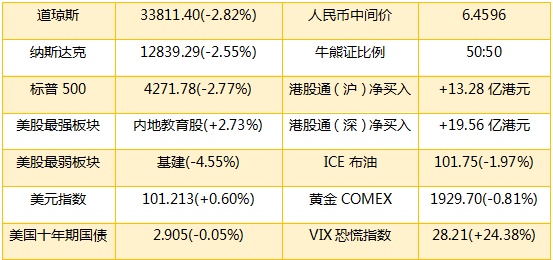 1.上周五美股截至收盘,道指收跌981.36点,跌幅为2.82%,报收于33811.40点;纳指跌335.36点,跌幅为2.55%,报收于12839.29点;标普500指数跌121.88点,跌幅为2.77%,报收于4271.78点。市场忧虑美息大幅飙升,加上美联储主席鲍威尔早前释放积极加息的鹰派讯号。港股ADR指数跟随下跌,按比例计算,收报20334点,跌304.03点或1.5%。