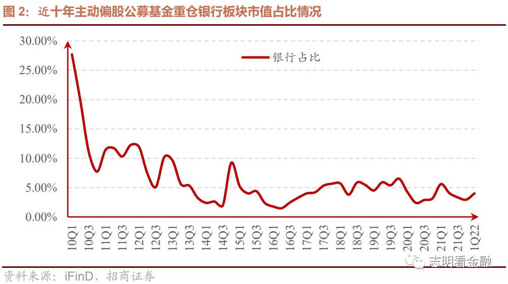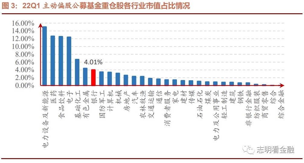 当前中证银行指数PB估值仅0.60倍,处于历史最低位;PE(TTM)估值仅5.3倍,亦处于历史低位,安全边际凸显。此外,2020年、2021年银行板块连续两年涨幅接近0,银行板块ROE达11%,当前估值修复动力较强。22Q1机构重仓股中银行板块市值占比4.0%,环比上升1.0个百分点,但考虑到一季度银行板块相对收益显著,机构实际加仓幅度较小。当前机构银行持仓比例仍处于低位,大幅低配,提升空间大。