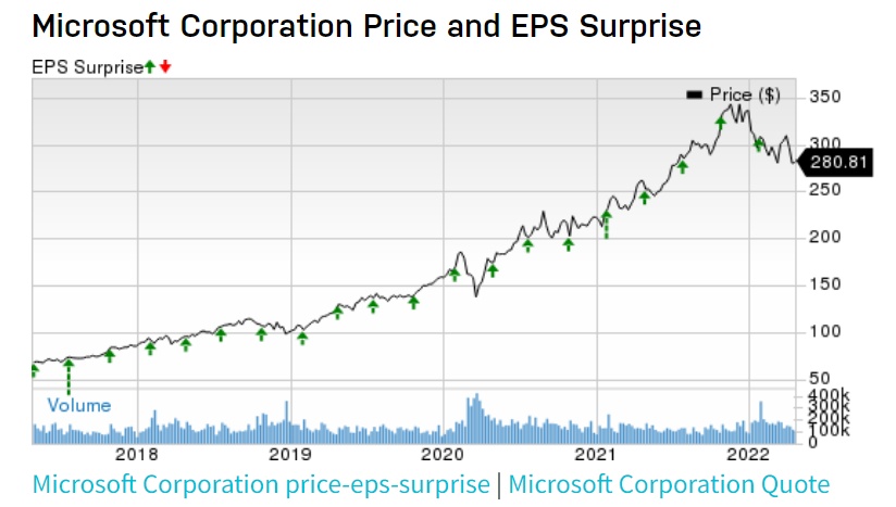 微软的股价及季度每股盈利在过去几个季度超过预期