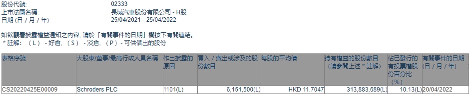 智通财经APP获悉,香港联交所最新资料显示,4月20日,Schroders PLC增持长城汽车(02333)615.15万股,每股作价11.7047港元,总金额约为7200.15万港元。增持后最新持股数目约为3.14亿股,最新持股比例为10.13%。
