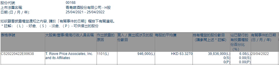 智通财经APP获悉,香港联交所最新资料显示,4月20日,T. Rowe Price Associates, Inc. and its Affiliates增持青岛啤酒股份(00168)94.6万股,每股作价63.3270港元,总金额约为5990.73万港元。增持后最新持股数目约为3983.6万股,最新持股比例为6.08%。