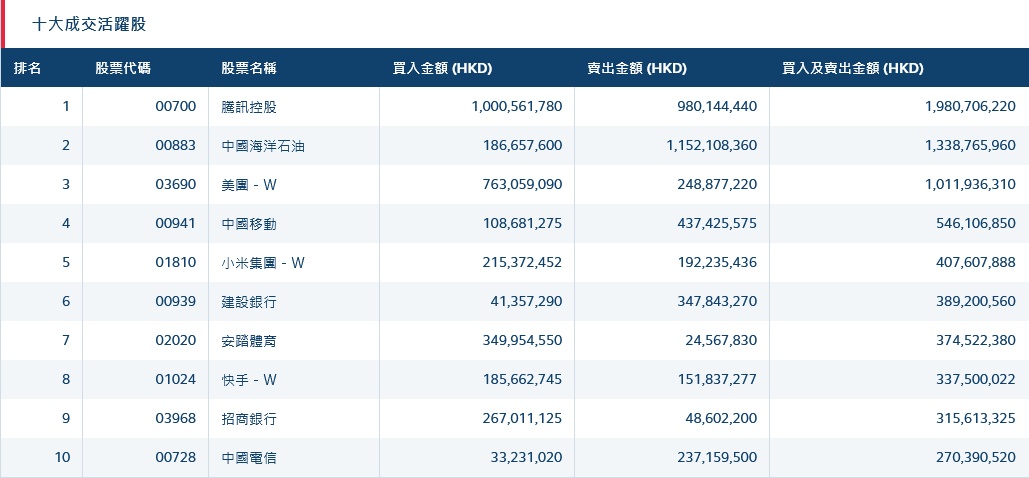 北水净买入最多的个股是美团-W(03690)、安踏体育(02020)、李宁(02331)。北水净卖出最多的个股是中海油(00883)、建设银行(00939)、腾讯(00700)。