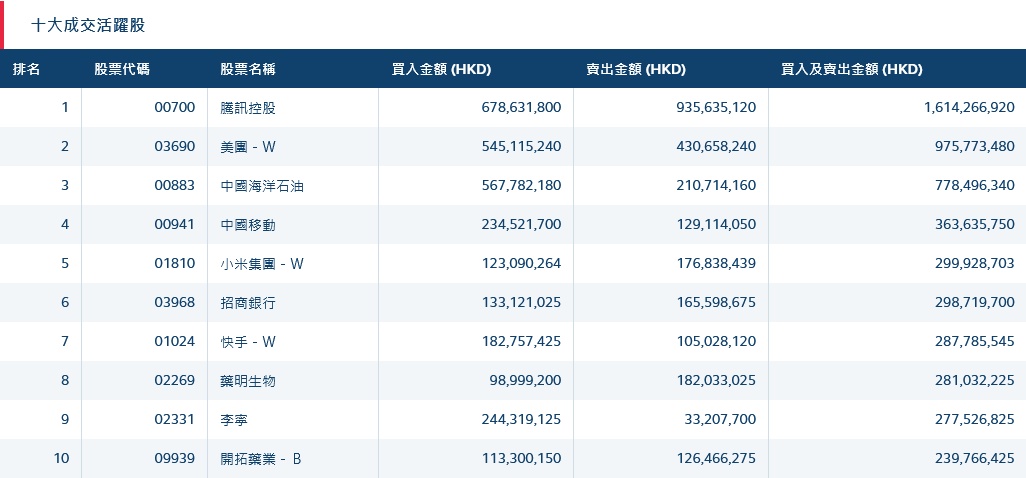此外,快手-W(01024)获净买入1.11亿港元。而中国移动(00941)、中国电信(00728)、开拓药业-B(09939)分别遭净卖出2.23亿、2.03亿、1316万港元。