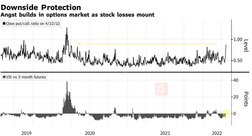 Piper Sandler & Co.期权部主管Danny Kirsch表示:“业绩并没有带来一些人期待已久的担忧缓解。目前唯一能起作用的就是对冲,由于对冲下跌需求旺盛,你会看到偏升、VIX倒挂、看跌期权成交量激增,这些都是极端避险下的预期。"