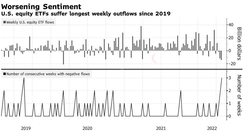 期权数据是股市投资者情绪恶化的最新证据。ETF投资者是2022年最坚定的看涨者之一,但他们正在放弃逢低买入策略。彭博汇编的数据显示,他们连续三周抛售股票——这是自2019年8月以来从未见过的持续抛售。