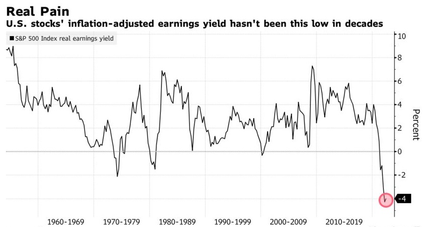 从估值角度来看,与炙热的通胀相比,股票的吸引力正在减弱。剔除通胀因素后的标普500指数实际收益20年来首次转为负值,达到至少1950年代以来的最低水平。