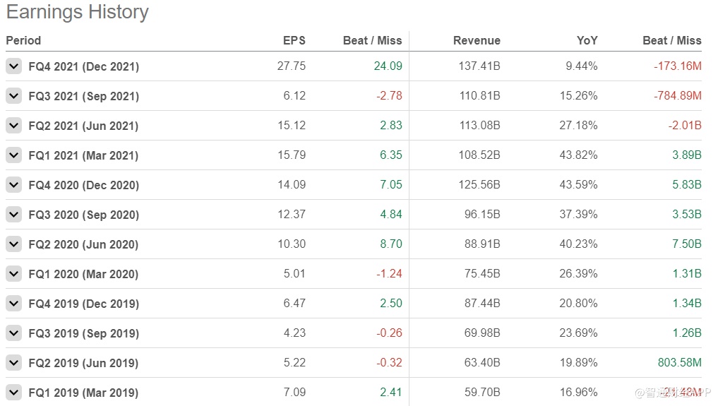 上个季度(2021年第四季度),亚马逊营收低于市场预期,但每股收益超出市场预期。而在2021年第三季度,亚马逊营收和每股收益均不及市场预期。在2021年第二季度,亚马逊营收也不及市场预期。