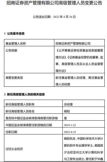 智通财经APP获悉,4月26日,招商证券资管子公司官网发布高级管理人员变更公告,原华鑫证券副总经理杨阳已出任招商证券资管总经理一职。