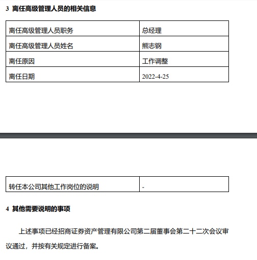 同时,原招商资管总经理熊志钢已因“工作调整”原因卸任总经理一职。对此,有消息称,熊志钢或改任招商资管副董事长兼合规总监,但在目前公告的“转任本公司其他工作岗位的说明”一栏,招商资管尚未进行披露,也尚未通过其他形式对外正式公告。招商证券表示,具体安排以正式公告为准。