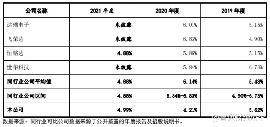 与同行业可比上市公司相比,公司2021年营收为4.26亿元,飞荣达(300602.SZ)、恒铭达(002947.SZ)与世华科技(688093.SH)分别为30亿元、11.3亿元和4.25亿元,公司收入规模相对较小,与世华科技处于同一水平。