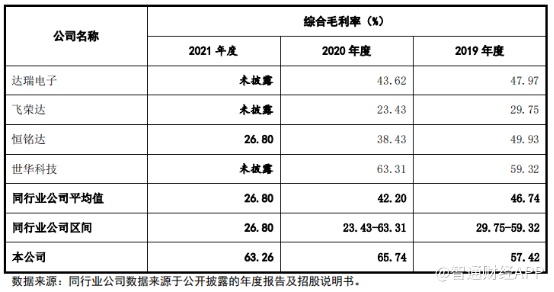 报告期内,公司主营业务毛利率分别为57.28%、65.73%及63.25%,大幅高于同行业可比公司,与世华科技大致相当。
