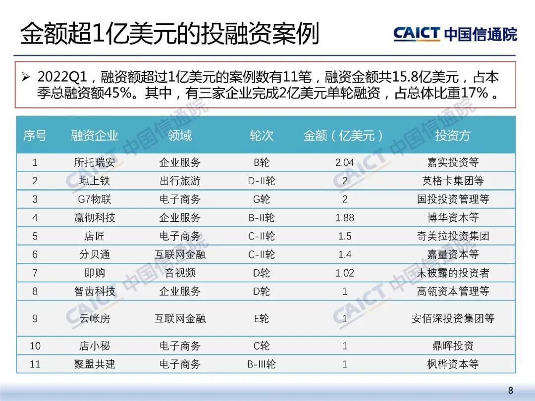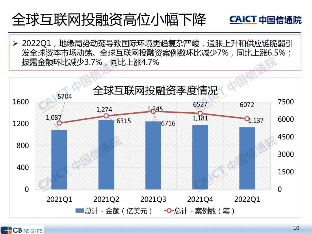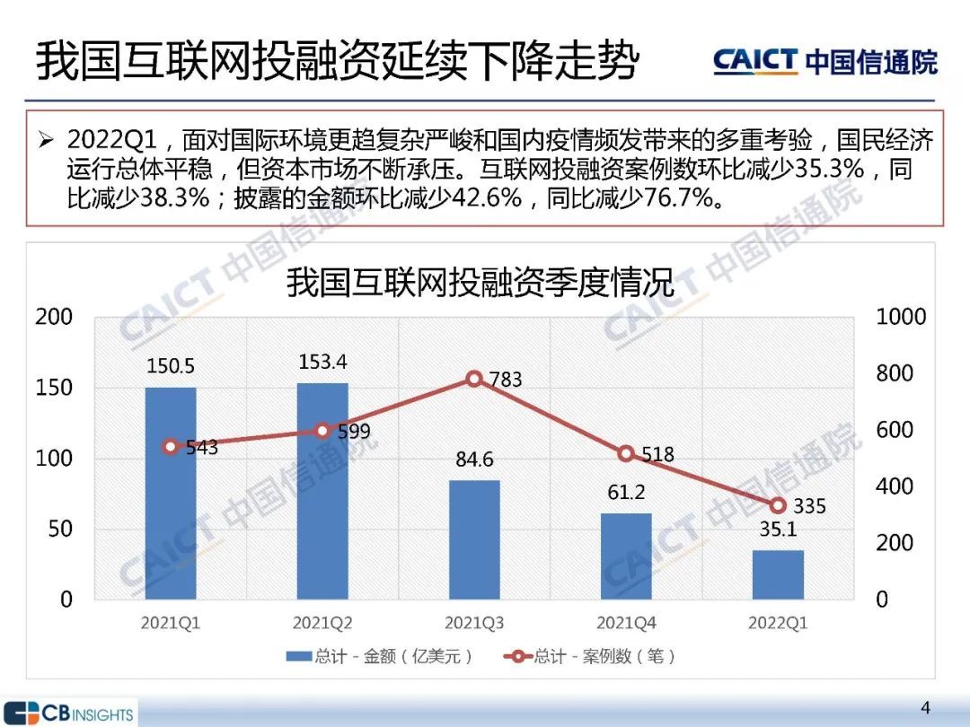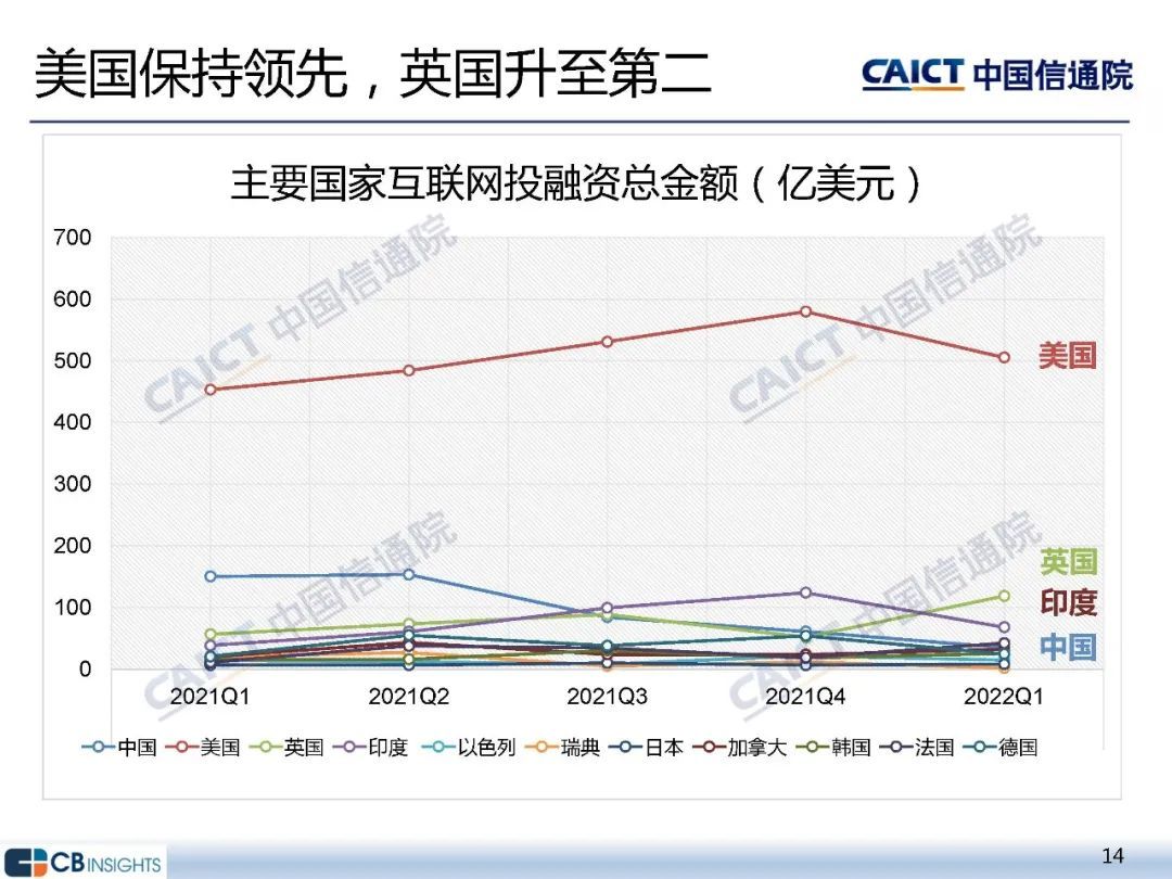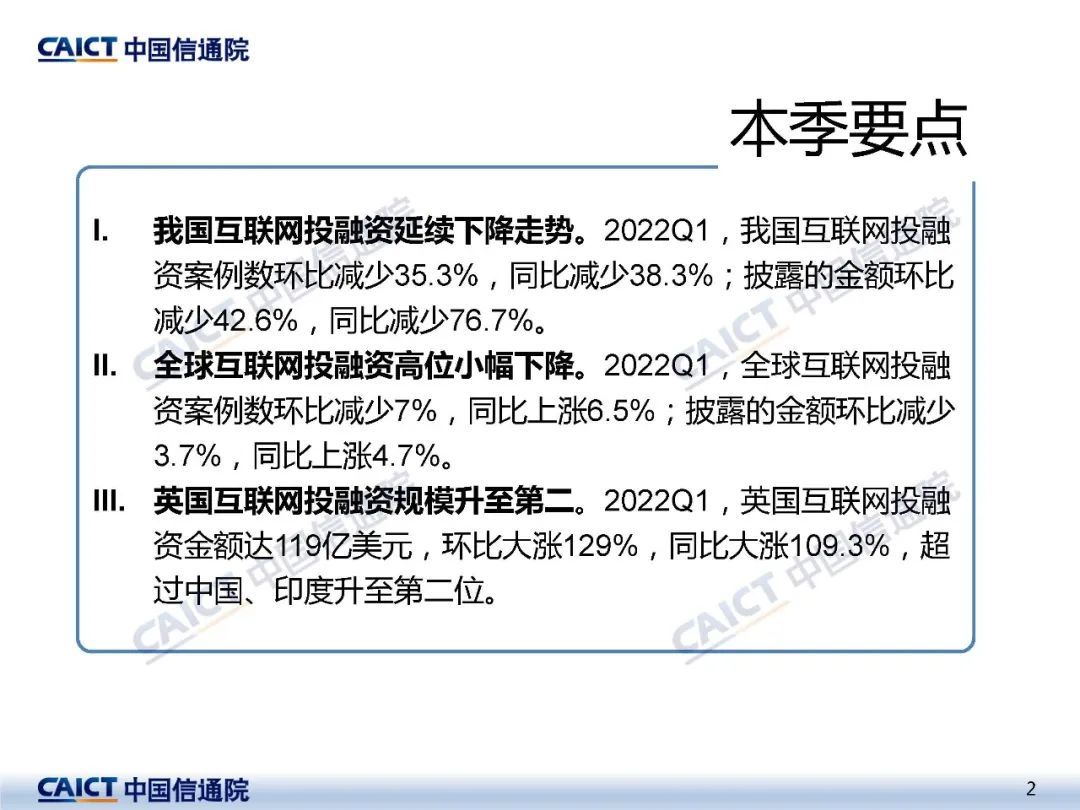 智通财经APP获悉,4月26日,中国信通院发布《2022年一季度互联网投融资运行情况》研究报告。报告显示,我国互联网投融资延续下降走势。2022Q1,我国互联网投融资案例数环比减少35.3%,同比减少38.3%;披露的金额环比减少42.6%,同比减少76.7%。全球互联网投融资高位小幅下降。2022Q1,全球互联网投融资案例数环比减少7%,同比上涨6.5%;披露的金额环比减少3.7%,同比上涨4.7%。英国互联网投融资规模升至第二。2022Q1,英国互联网投融资金额达119亿美元,环比大涨129%,同比大涨109.3%,超过中国、印度升至第二位。