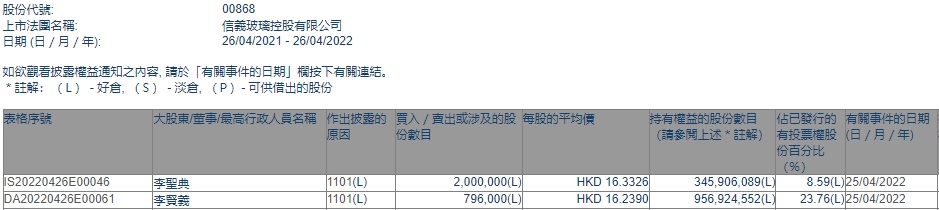 智通财经APP获悉,香港联交所最新资料显示,4月25日,股东李圣典、执行董事李贤义分别增持信义玻璃(00868)200万股、79.6万股,每股作价分别为16.3326港元、16.2390港元。增持涉及总金额约为4559.14万港元。增持后李圣典、李贤义最新持股数目分别约为3.46亿股、9.57亿股,最新持股比例分别为8.59%、23.76%。