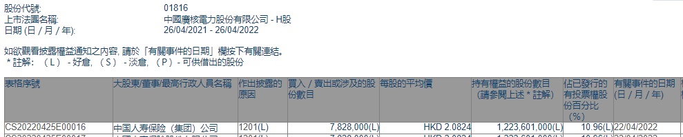 智通财经APP获悉,香港联交所最新资料显示,4月22日,中国人寿保险(集团)公司减持中广核电力(01816)782.8万股,每股作价2.0824港元,总金额约为1630.10万港元。减持后最新持股数目约为12.24亿股,最新持股比例为10.96%。