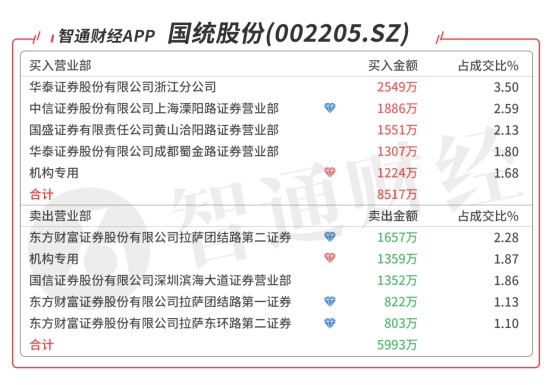 国统股份(002205.SZ):龙虎榜阵容豪华,机构席位对倒当日买卖均衡,买一是知名游资赵老哥的席位买入2549万元,买二是知名游资孙哥的席位买入1886万元,当日净买入4498万元,该股今日底部涨停,预计压力位在20日线附近。