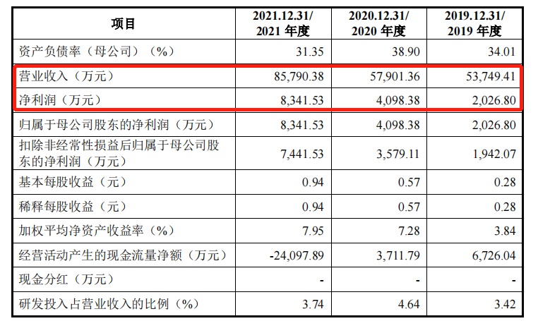 营收方面,2019年至2021年,该公司实现营收分别为5.37亿元、5.79亿元和8.58亿元;实现净利润为8341.53万元、4098.38万元、2026.80万元,整体而言,受受宏观经济和下游行业景气程度影响利好,这三年其营收还是是处于比较稳定发展的态势。