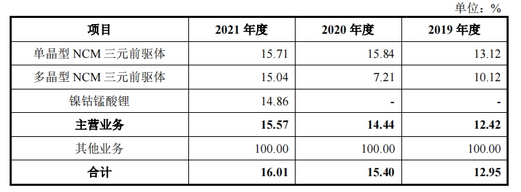 从产品结构来看,帕瓦股份的核心收入主要源自于单晶型NCM三元前驱体。据悉,该公司的收入结构主要分为单晶型NCM三元前驱体、多晶型NCM三元前驱体。其中,单晶型NCM三元前驱体为公司的核心收入来源,2019年至2021年,这一产品的占比分别为76.41%、83.70%、80.19%。由此不难看出,正是单晶型NCM三元前驱体收入的增长促成了该公司收入的稳定增长。