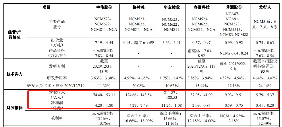 此外,另据数据显示,2019年中国三元前驱体企业数量为45家,其中外销企业15家,其余均以自产自销为主。截至目前,帕瓦股份在业内的主要竞争对手分别是中伟股份、格林美、华友钴业、容百科技和芳源股份这几家三元前驱体厂家,不过从营收和净利润规来看,该公司目前均稍逊这几大竞争对手一筹。