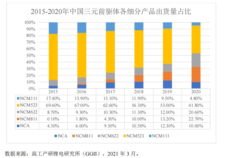 具体而言,国内市场方面,2015年至2020年,中国三元前驱体出货量迅速攀升,2020年出货量达到33万吨,复合增长率达52.51%。另据GGII预测,2025年中国三元前驱体出货量将达到119万吨,较2020年的年均复合增长率为29.24%,占全球市场的比例为74.38%。