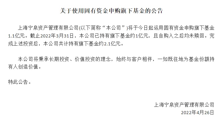 智通财经APP获悉,4月26日,宁泉资产发布公告,将于今日起运用固有资金申购旗下基金1.1亿元。截止2022年3月31日,该公司已持有旗下基金约1亿元,且自购入之后均未赎回。完成上述投资后,该公司共计持有旗下基金约2.1亿元。