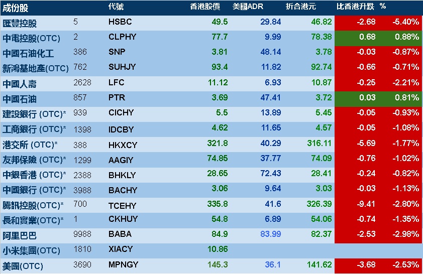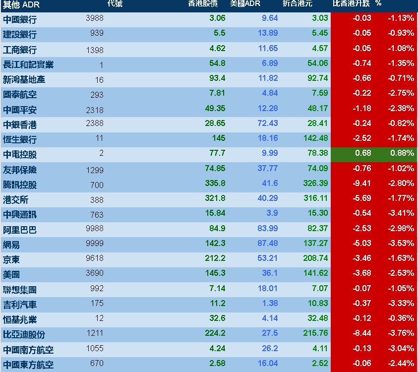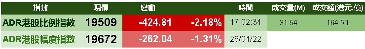 智通财经APP获悉,周二美股三大指数悉数下跌,港股ADR指数下跌,按比例计算,收报19509点,较香港收市跌424.81点或2.18%。