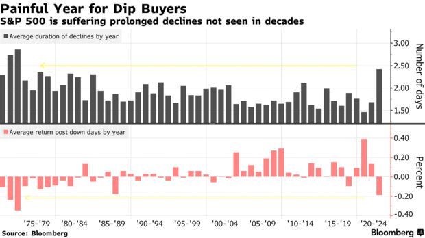 事实证明,今年试图在股市每次下跌时都抄底所需付出的代价比上世纪70年代以来的任何时候都要昂贵。