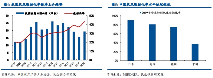 首先,就数控化进程来看,据中国机床工具工业协会的数据,2007-2020年中国制造业机床的数控化率由17%大幅提升至43%。但与老牌工业发达国家相比,我国机床数控化率仍显著偏低。以2019年为例,我国机床数控化率为37%,相当于日本上世纪八十年代的水准,而如今日本和德国分别已达到90%、75%。可见,对标海外发达国家,中国数控机床仍有非常大的增长空间。
