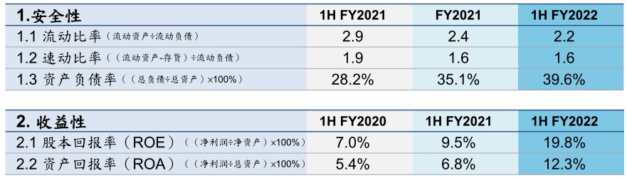 在核心财务数据保持高速增长的同时,津上中国的经营数据亦保持稳健。例如,从偿债能力看,2022上半财年公司的流动比率2.2倍,速动比率1.6倍,偿债能力优异。