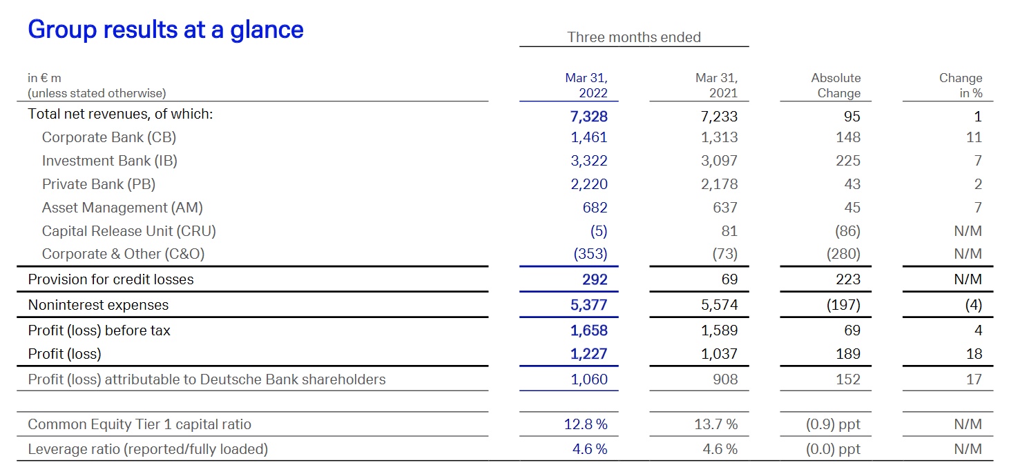 财报显示,德意志银行第一季度净营收为73.28亿欧元,上年同期为72.33亿欧元,同比增长1%;税前利润为16.58亿欧元,上年同期为15.89亿欧元,同比增长4%;净利润为12.27亿欧元,创下2013年以来的最高水平,好于市场普遍预期的11.2亿欧元,上年同期为10.37亿欧元,同比增长18%。