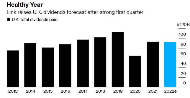 咨询公司Link Group Plc表示,矿业和石油公司增加了派息额,同时,与1月份的预期相比,英国银行业的派息额预期上调了45亿英镑。而全年经调整后的股息支付预期较此前预期上涨15%,达至858亿英镑。Link Group负责英国和欧洲企业市场业务的董事总经理Ian Stokes表示:“由于大宗商品和石油价格的飙升,提振了英国两个最大派息行业的前景,而银行股派息方面,在后新冠疫情时代,继续以略快于我们预期的速度复苏。”