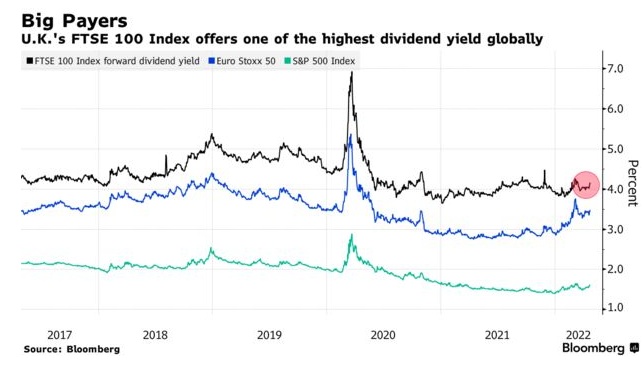 该国的富时100指数在今年迄今几乎没有变化,而标准普尔500指数则下跌了逾10%。富时100指数的远期股息率约为4%,仍是全球股市中的最高之一。