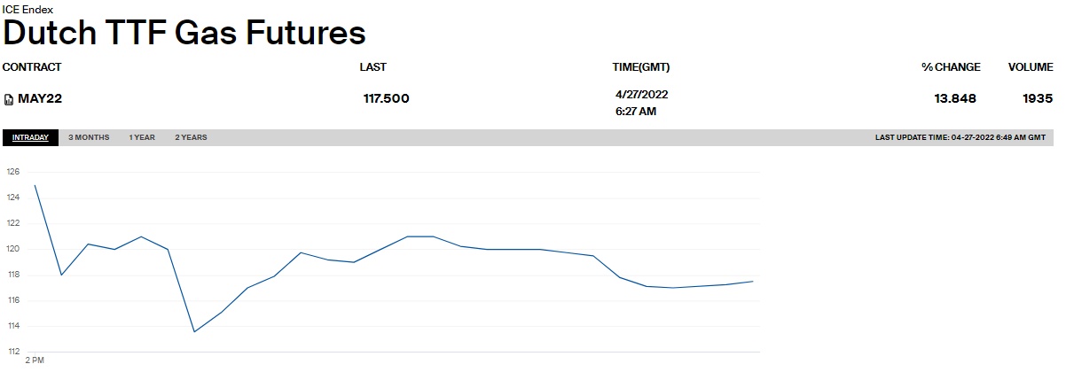 消息公布后,欧洲基准TTF荷兰天然气期货一度飙升24%,至127.5欧元/兆瓦时,创4月1日以来的最高水平,截至发稿,该期货涨13.85%,报117.5欧元/兆瓦时。