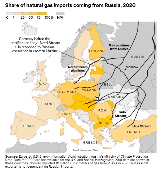 据悉,欧洲国家的天然气主要依赖于进口供应。数据显示,芬兰、拉脱维亚、波黑、摩尔多瓦等国进口天然气中,俄罗斯天然气占比超过90%。另外,保加利亚接近80%、波兰超过40%、法国接近25%的天然气也从俄罗斯进口。