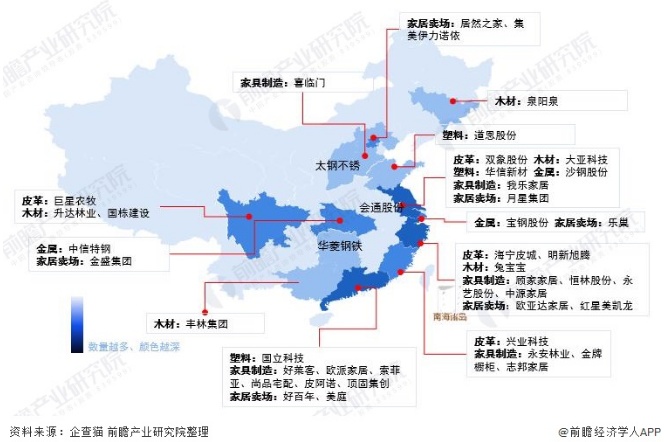中国家居行业代表性企业区域分布热力图(前瞻产业研究院)