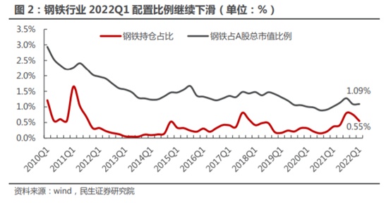 事实上,股价的下跌仅是钢铁板块走向弱势的表观体现。从机构持仓角度来看:2022Q1基金减持钢铁股票,钢铁板块配置比例环比下滑0.21pct,至0.55%。2020Q4以来,随着“双碳”等政策推进,钢价重心整体向上,叠加行业整合力度逐步加大,钢铁行业竞争格局改善预期较强,基金对钢铁配置比例逐步抬升,从2020Q3的0.15%,持续攀升至2021Q3的0.80%。但随着2021Q4钢价下跌,钢铁板块盈利预期变差,基金对钢铁板块配置比例连续下滑。