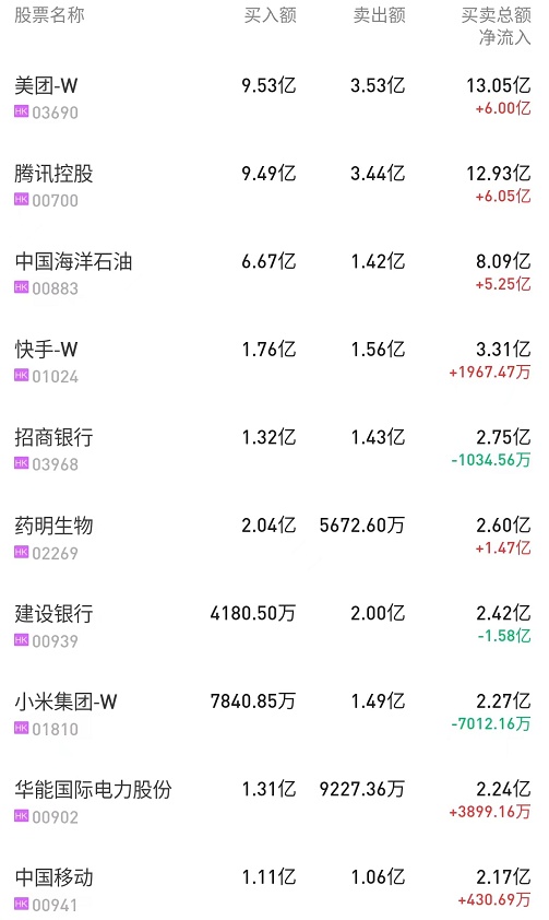 北水净买入最多的个股是美团-W(03690)、中海油(00883)、腾讯(00700)。北水净卖出最多的个股是建设银行(00939)、中国移动(00941)、中芯国际(00981)。