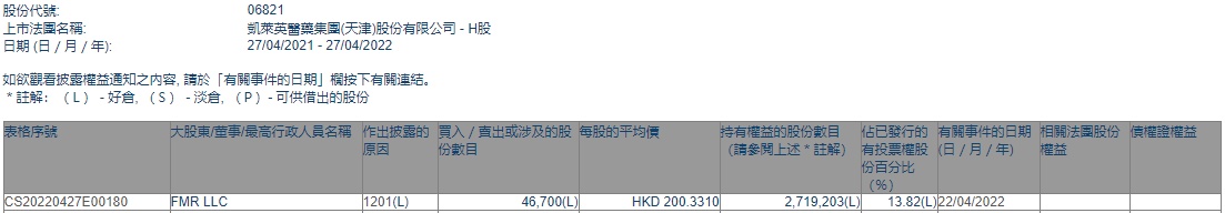 智通财经APP获悉,香港联交所最新资料显示,4月22日,FMR LLC减持凯莱英(06821)4.67万股,每股作价200.331港元,总金额约为935.55万港元。减持后最新持股数目约为271.92万股,最新持股比例为13.82%。