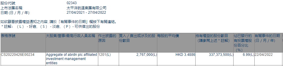 智通财经APP获悉,香港联交所最新资料显示,4月22日,Aggregate of abrdn plc affiliated investment management entities减持太平洋航运(02343)276.7万股,每股作价3.4886港元,总金额约为965.30万港元。减持后最新持股数目约为3.37亿股,最新持股比例为6.99%。