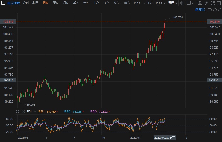 美元指数自4月以来涨幅达到4.45%,有望成为自2015年1月以来表现最好的一个月。分析人士普遍认为美元走高的主要原因是市场对美联储将在未来几个月大幅度加息的预期不断上升,以及美国经济的表现将好于欧元区经济。