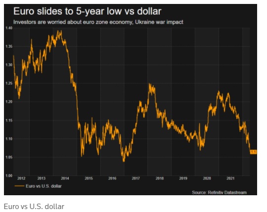 分析人士普遍认为,欧元走弱的主要原因是投资者越来越担心全球经济增长放缓和通胀持续走高,进而纷纷买入美元寻求避险,同时投资者还担忧企业最新业绩不及预期,这也使得全球股市屡遭重挫,科技股基准指数纳斯达克100指数昨日收盘时跌幅接近4%,指数创下去年5月以来的最低水平。