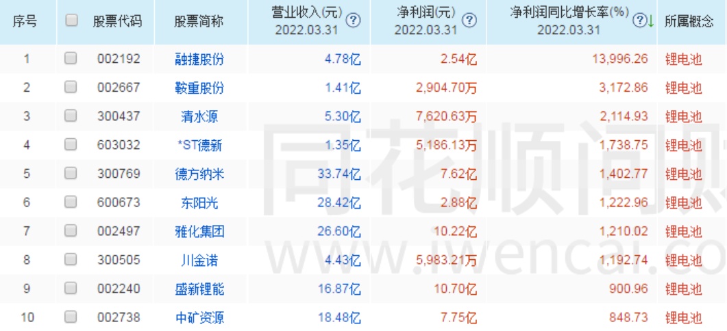 截至4月25日,多家锂电池概念股披露了2022年一季度业绩。据同花顺数据显示,2022年一季度,有近10家锂电池概念股净利润同比增速逾1000%,有近40家锂电概念股净利润同比增速逾100%。更有甚者的是,融捷股份期内净利润增速达到了13996.26%,鞍重股份期内净利润增速则达到3172.86%。