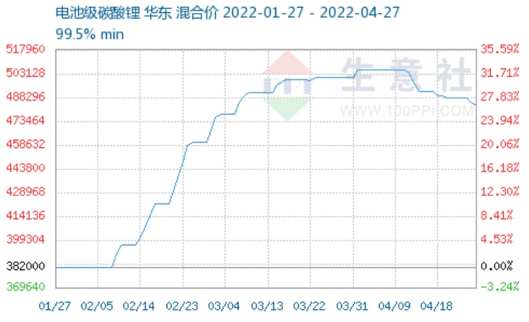 具体而言,清明节前后,受上海和长春等地疫情蔓延影响,特斯拉、蔚来、一汽等车企均有不同程度停产,叠加疫情管控下车企零部件供应受阻,市场对新能源汽车需求担忧情绪较重,百川锂价自4月11日开始回调,截至4月26日电碳报价为47.54万元/吨。锂精矿价格仍继续走高,二季度澳矿长协价在5000美元/吨左右,成本端对锂盐价格形成支撑。随着各地疫情的有效管控,特斯拉等车企已正式复产,预计三季度新能源汽车产销量将恢复旺季增速,锂价有望止跌企稳,维持高位运行。