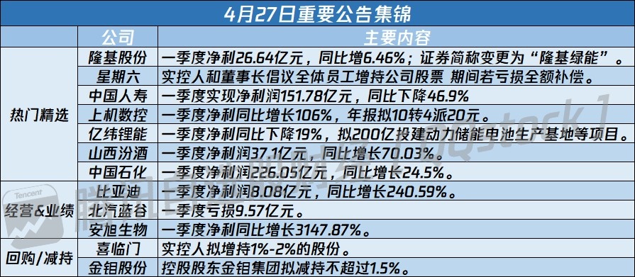 隆基股份:2022年一季度净利润26.64亿元,同比增长6.46%。公告同日,隆基股份2021年归属于母公司所有者的净利润90.86亿元,同比增长6.24%;拟10转4派2.6元。另一份公告称,拟将公司证券简称变更为“隆基绿能”。