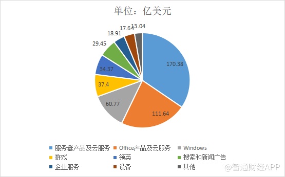 细分来看,在微软各业务板块中,营收占比最大的分别是服务器及云服务、办公软件Office及云服务、Windows操作系统,金额分别为170.38亿美元、111.64亿美元、60.77亿美元,占总营收比例分别为34%、23%、12%。
